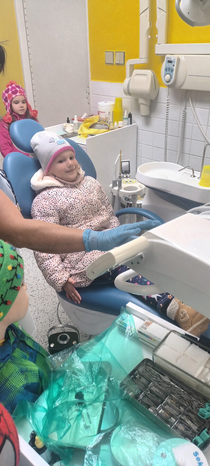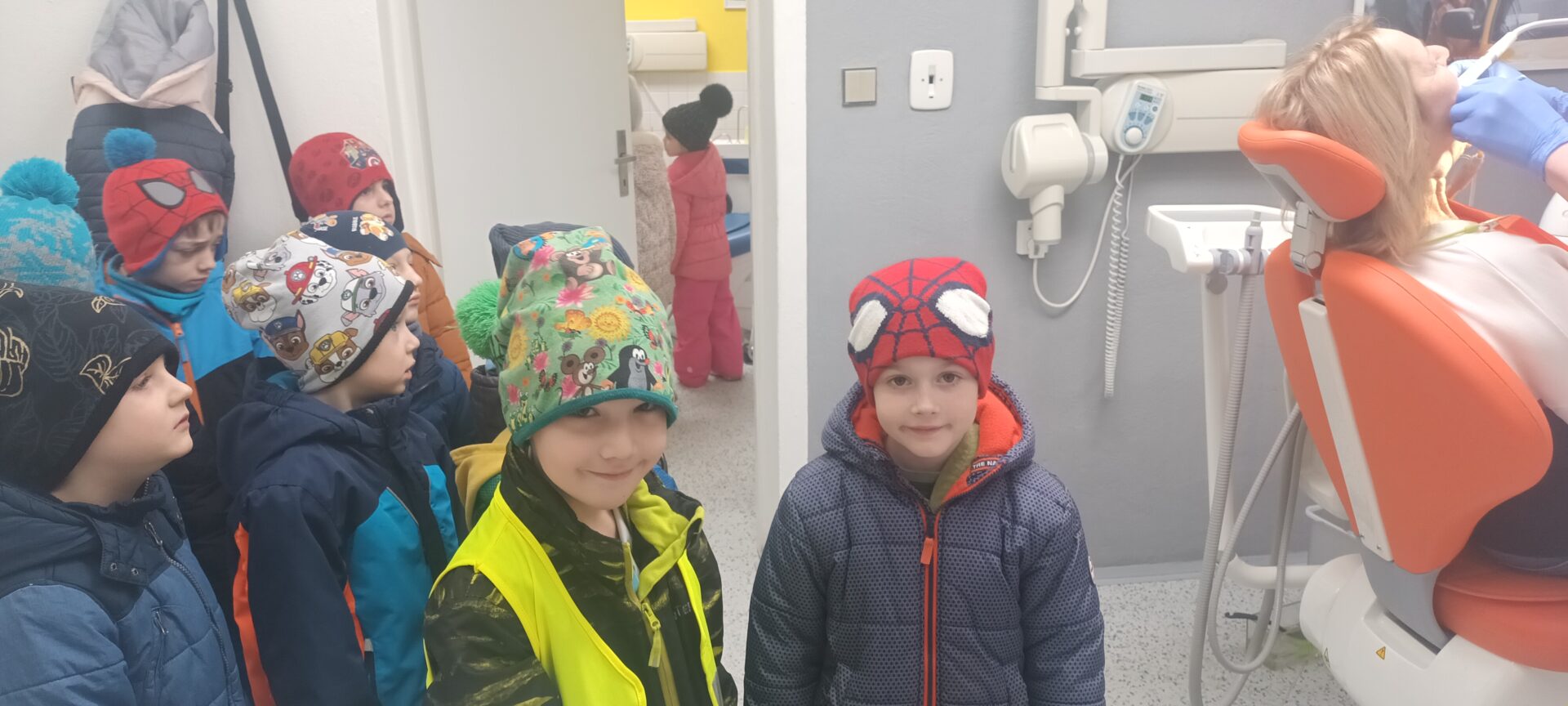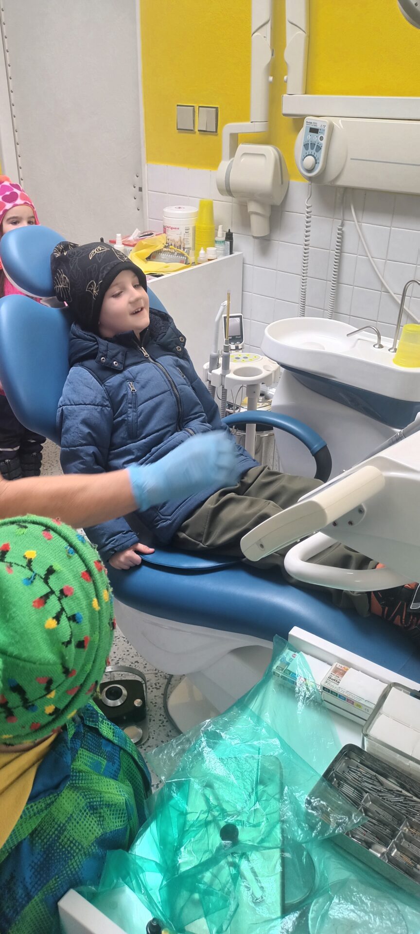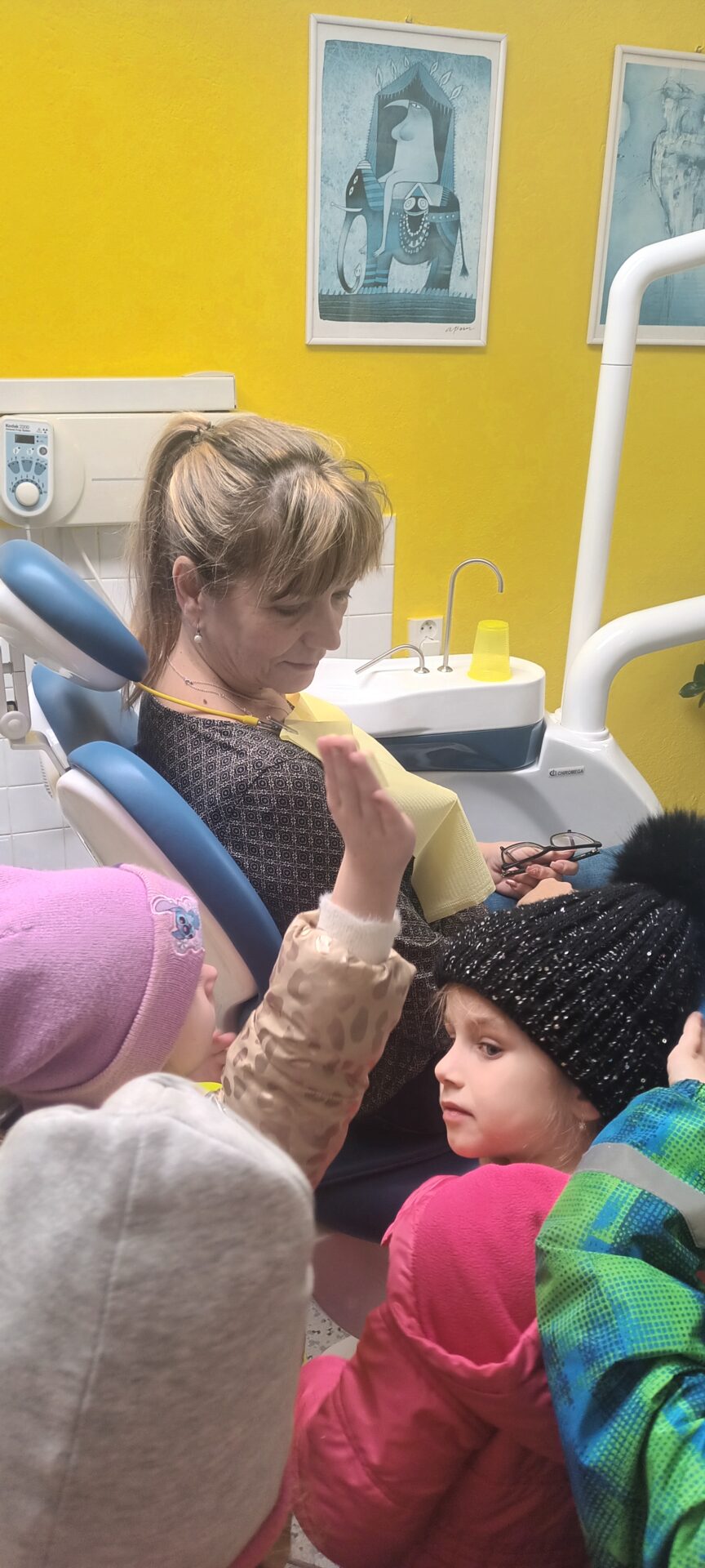 Dnes jsme navštívili zubní ordinaci, kde jsme si mohli v klidu a hlavně beze strachu vše prohlédnout, (někteří se přesto tvářili, jako by jim pan zubař měl vytrhnout všechny zuby). Odvážlivci si sedli do zubařského křesla a sestřička je povozila nahoru a dolů. Nakonec všichni dostali pravé zubařské zrcátko. Teď už děti vědí, že když si budou pravidelně a pečlivě čistit zoubky, nemusí se bát chodit k zubaři, který jen preventivně zoubky prohlédne.