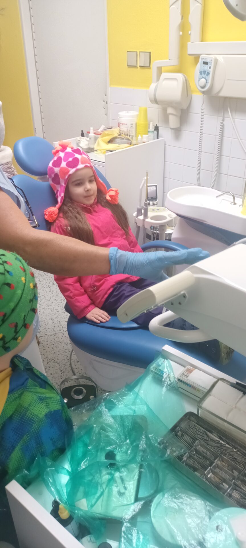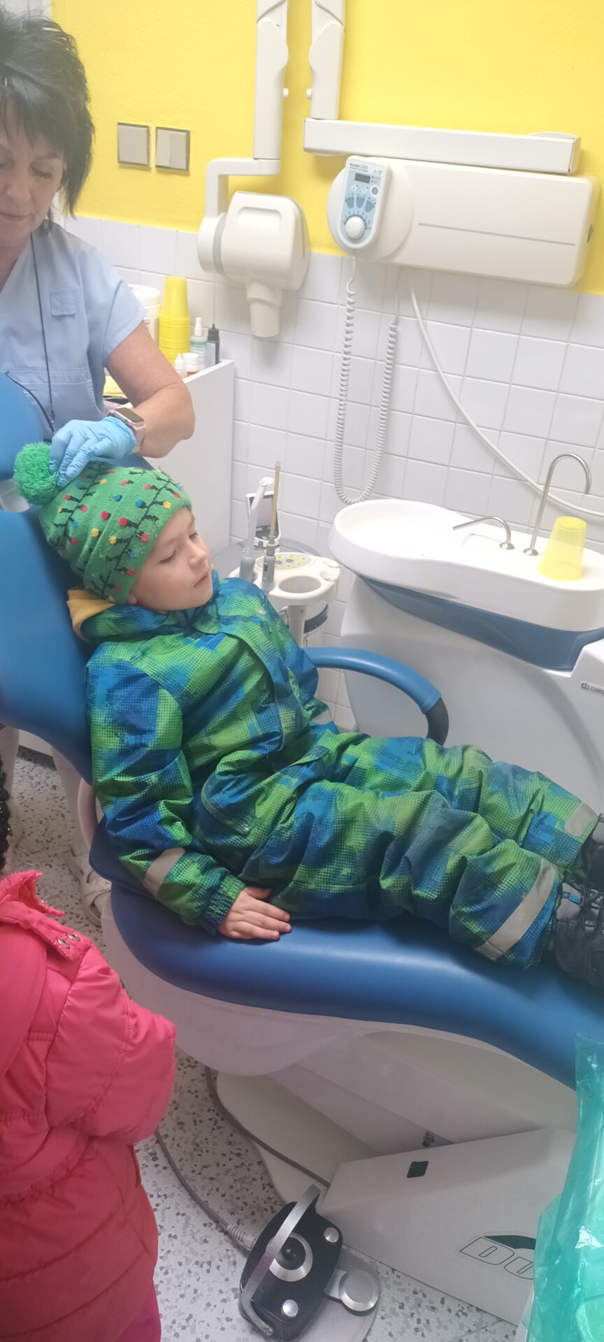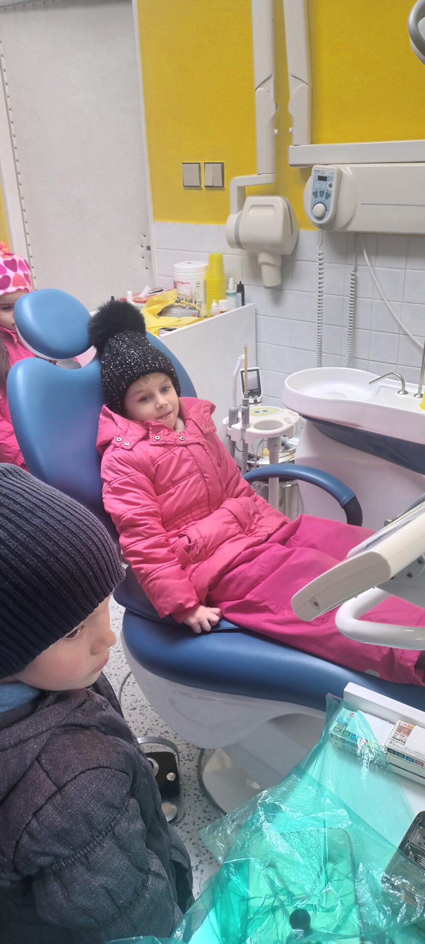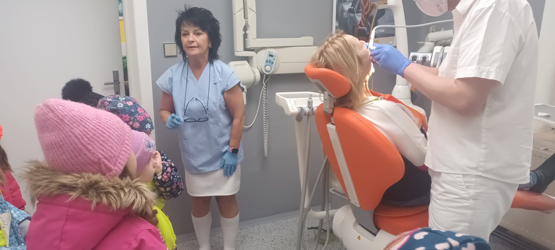 Dnes jsme navštívili zubní ordinaci, kde jsme si mohli v klidu a hlavně beze strachu vše prohlédnout, (někteří se přesto tvářili, jako by jim pan zubař měl vytrhnout všechny zuby). Odvážlivci si sedli do zubařského křesla a sestřička je povozila nahoru a dolů. Nakonec všichni dostali pravé zubařské zrcátko. Teď už děti vědí, že když si budou pravidelně a pečlivě čistit zoubky, nemusí se bát chodit k zubaři, který jen preventivně zoubky prohlédne.