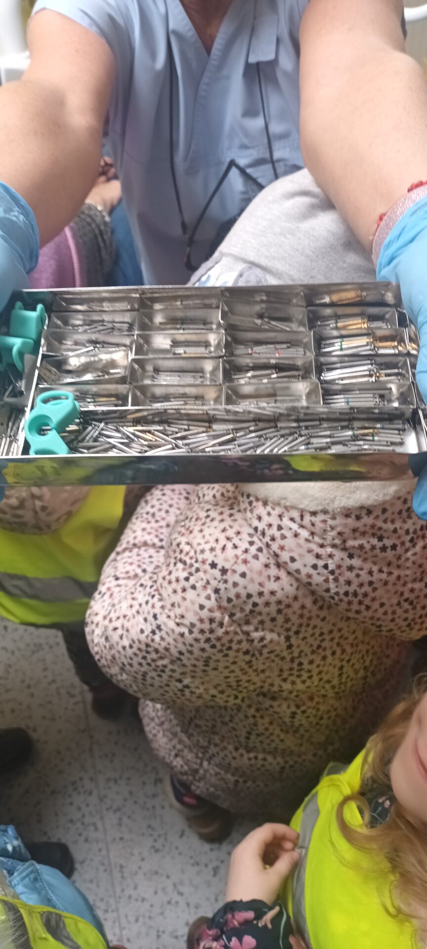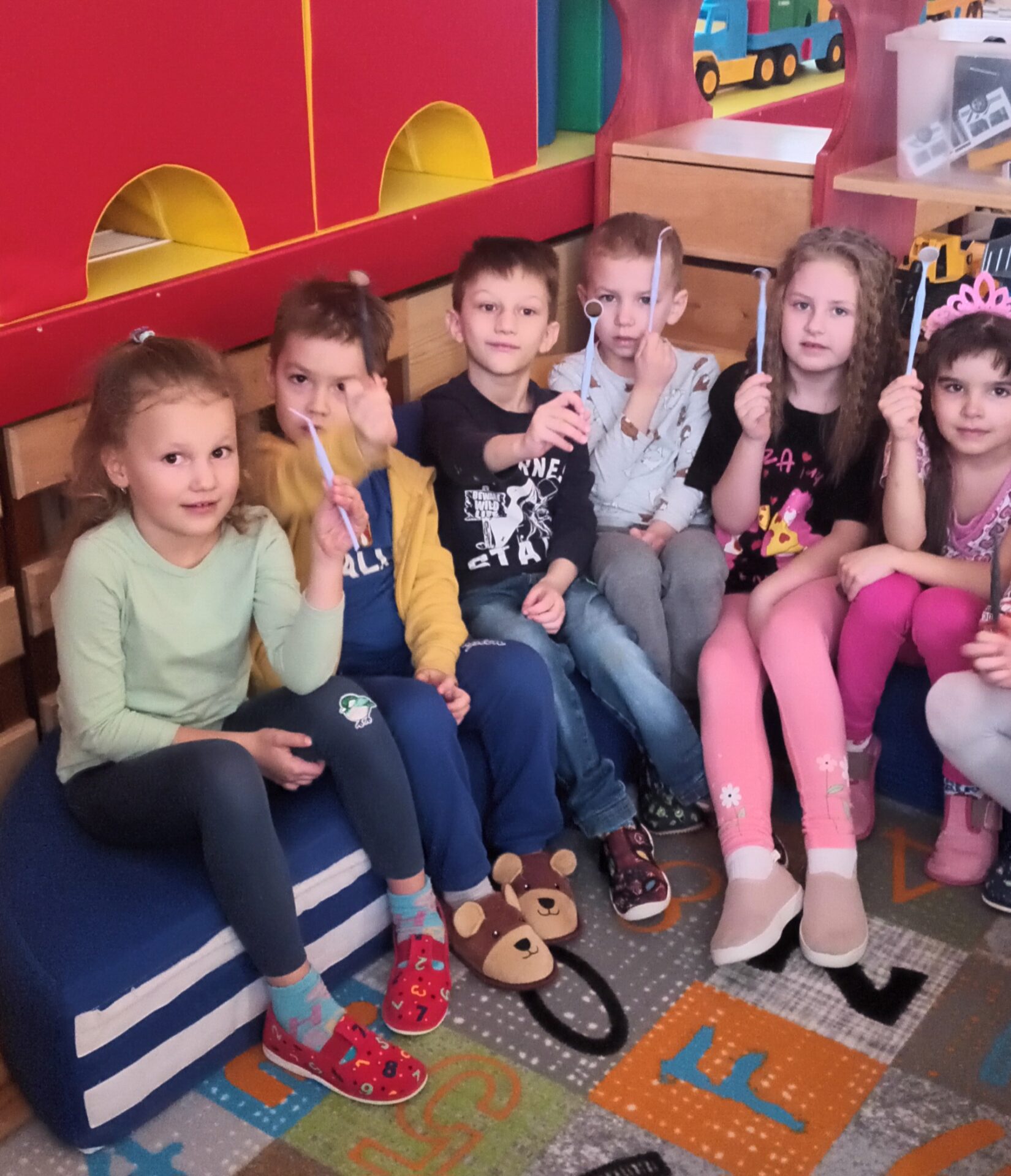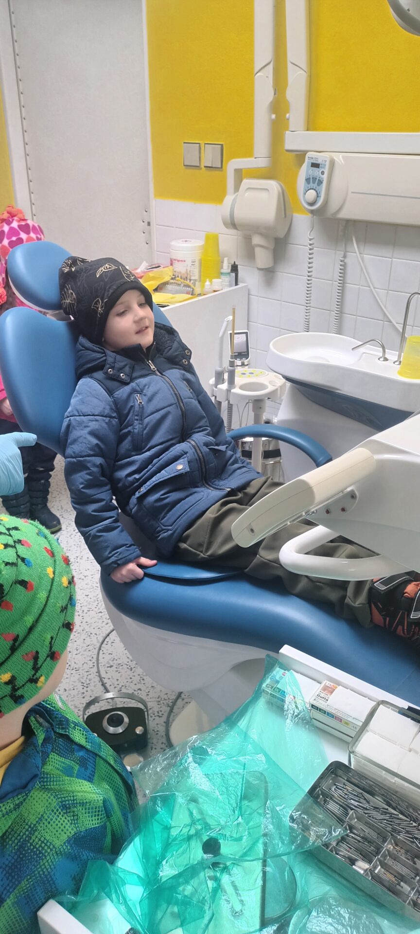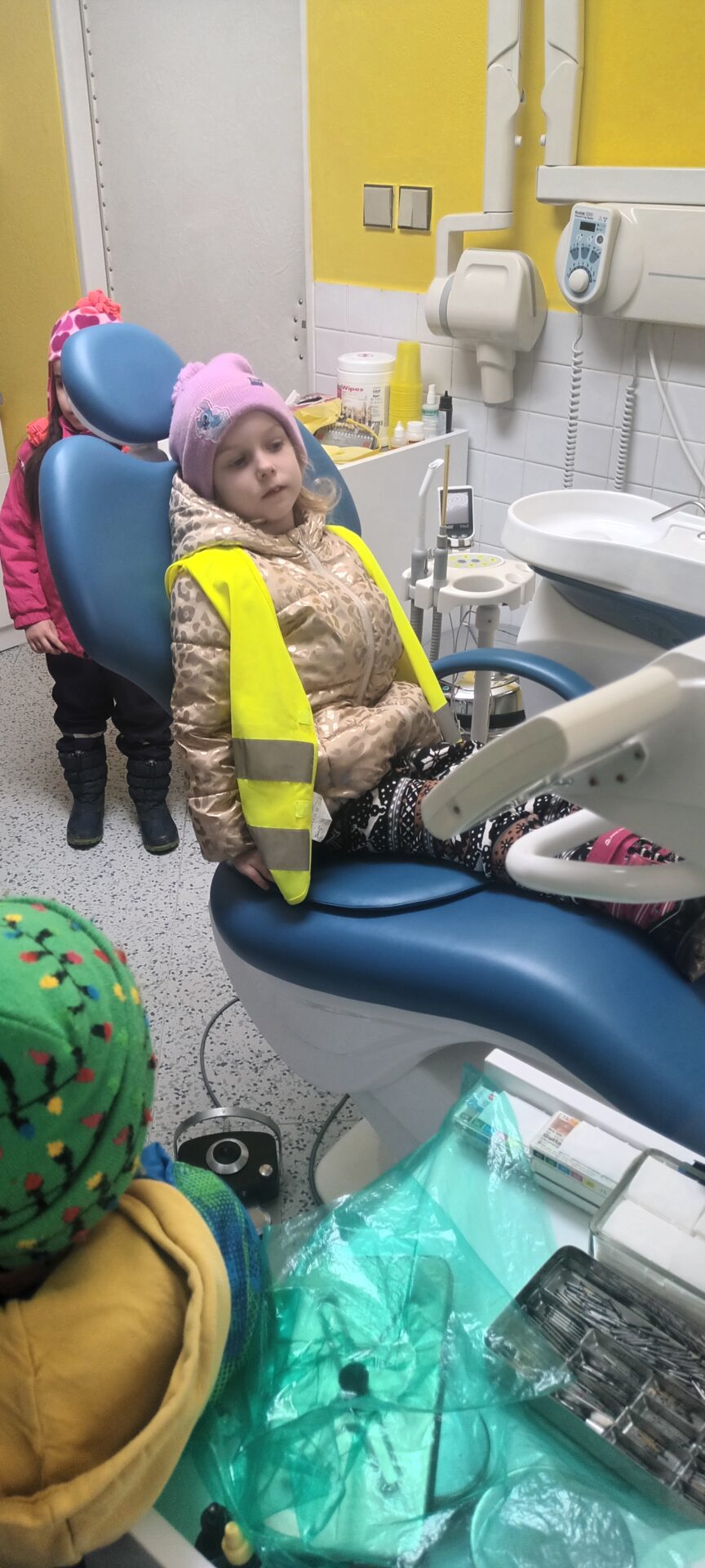 Dnes jsme navštívili zubní ordinaci, kde jsme si mohli v klidu a hlavně beze strachu vše prohlédnout, (někteří se přesto tvářili, jako by jim pan zubař měl vytrhnout všechny zuby). Odvážlivci si sedli do zubařského křesla a sestřička je povozila nahoru a dolů. Nakonec všichni dostali pravé zubařské zrcátko. Teď už děti vědí, že když si budou pravidelně a pečlivě čistit zoubky, nemusí se bát chodit k zubaři, který jen preventivně zoubky prohlédne.